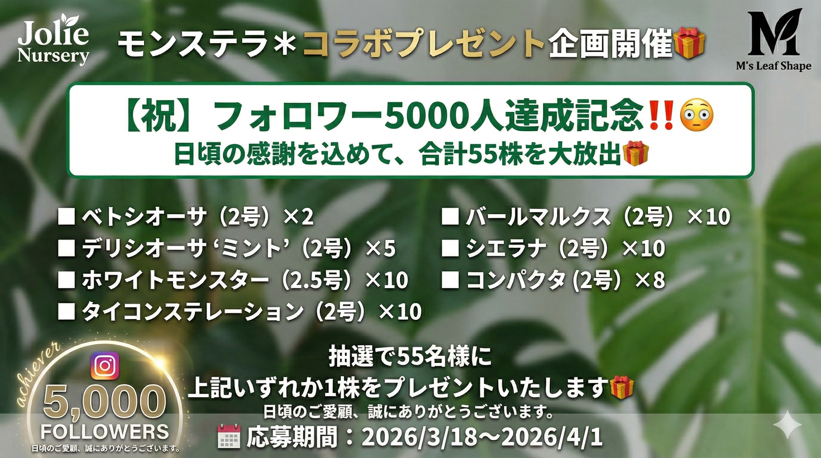 【55名様に当たる!】モンステラ豪華プレゼント企画開催。ミント、ホワイトモンスター、タイコンステレーションなど、希少種を含む全55株をご用意しました。参加条件や応募方法をチェックして, ぜひJolie Nurseryの特別なイベントにご参加ください!
