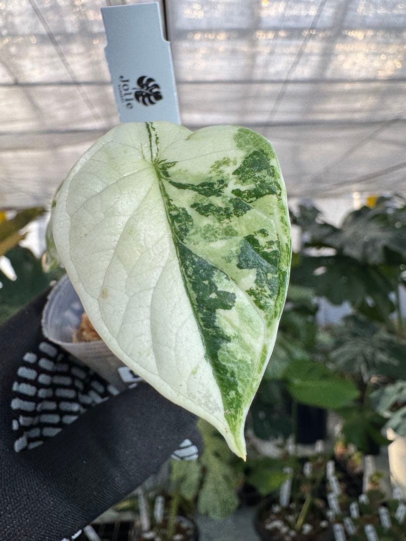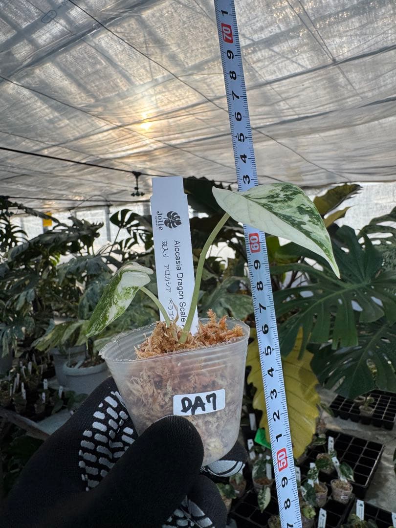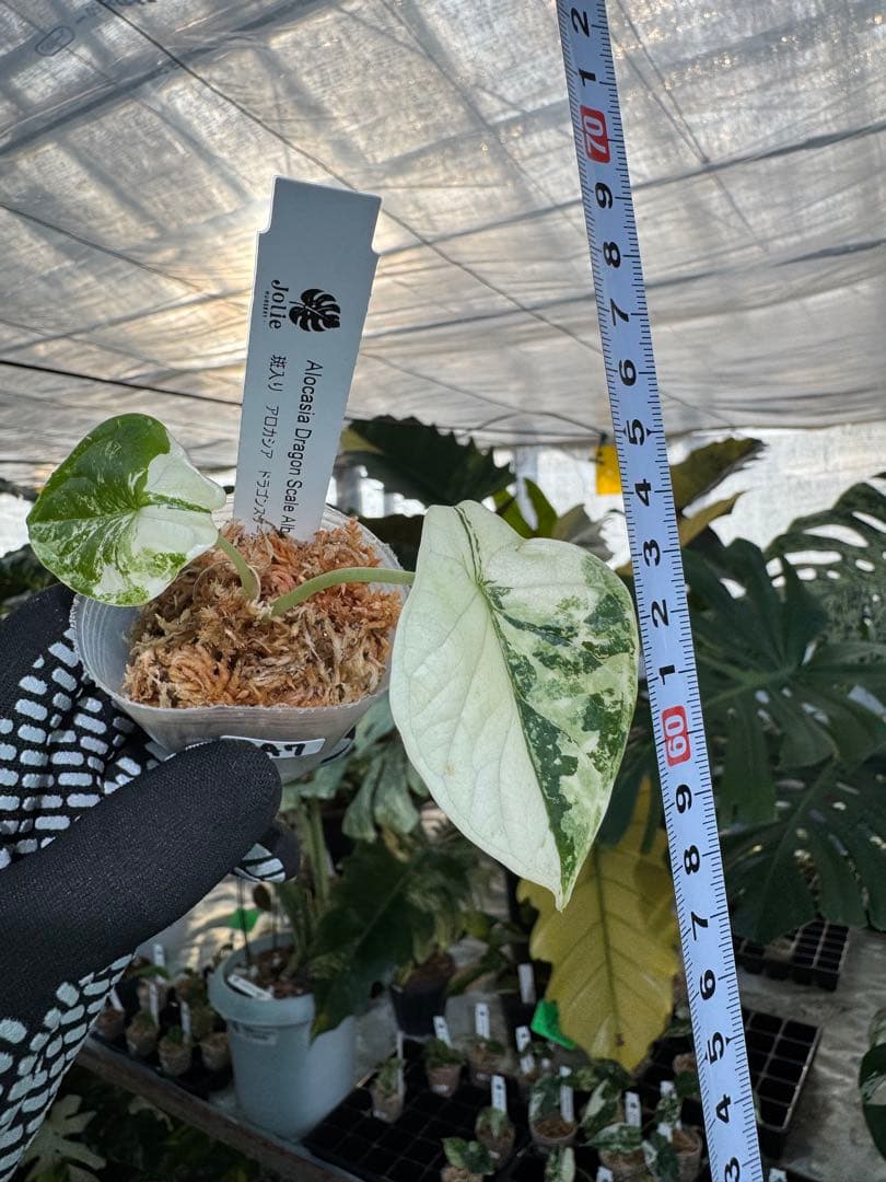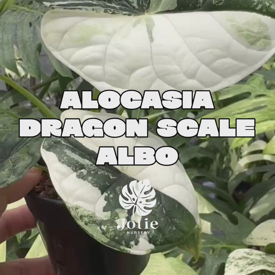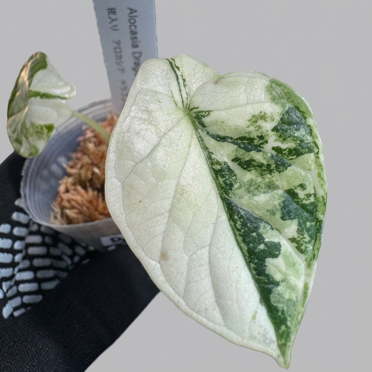 アロカシアの中でも、その名の通り「龍の鱗」を思わせる立体的で重厚な葉脈が特徴のドラゴンスケール。その極めて希少な白斑(アルボ)個体がついに登場です。 銀色がかった深い緑色の葉に、鮮やかなホワイトの斑が入り混じる姿は、まさに幻想的な美しさを放ちます。