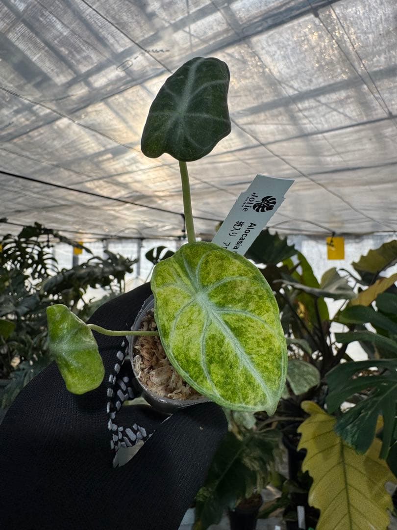漆黒の盾に刻まれる、光の斑。極希少種「アロカシア・ニンジャ 斑入り」
