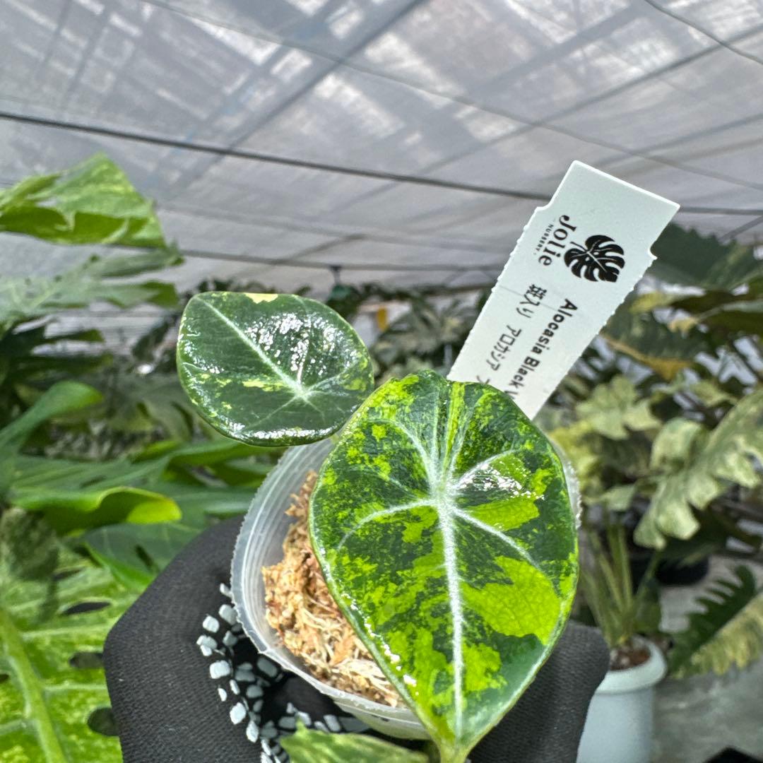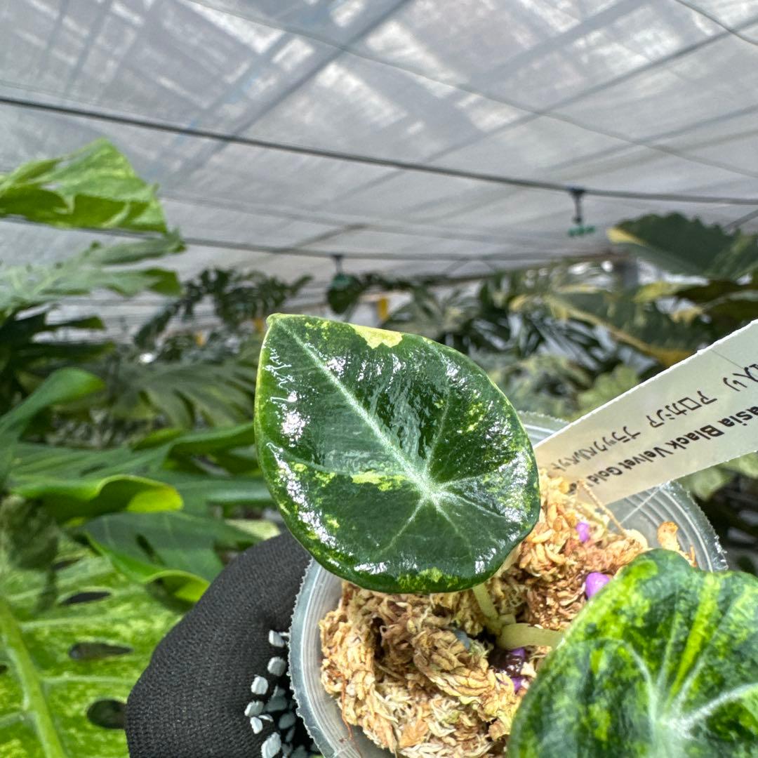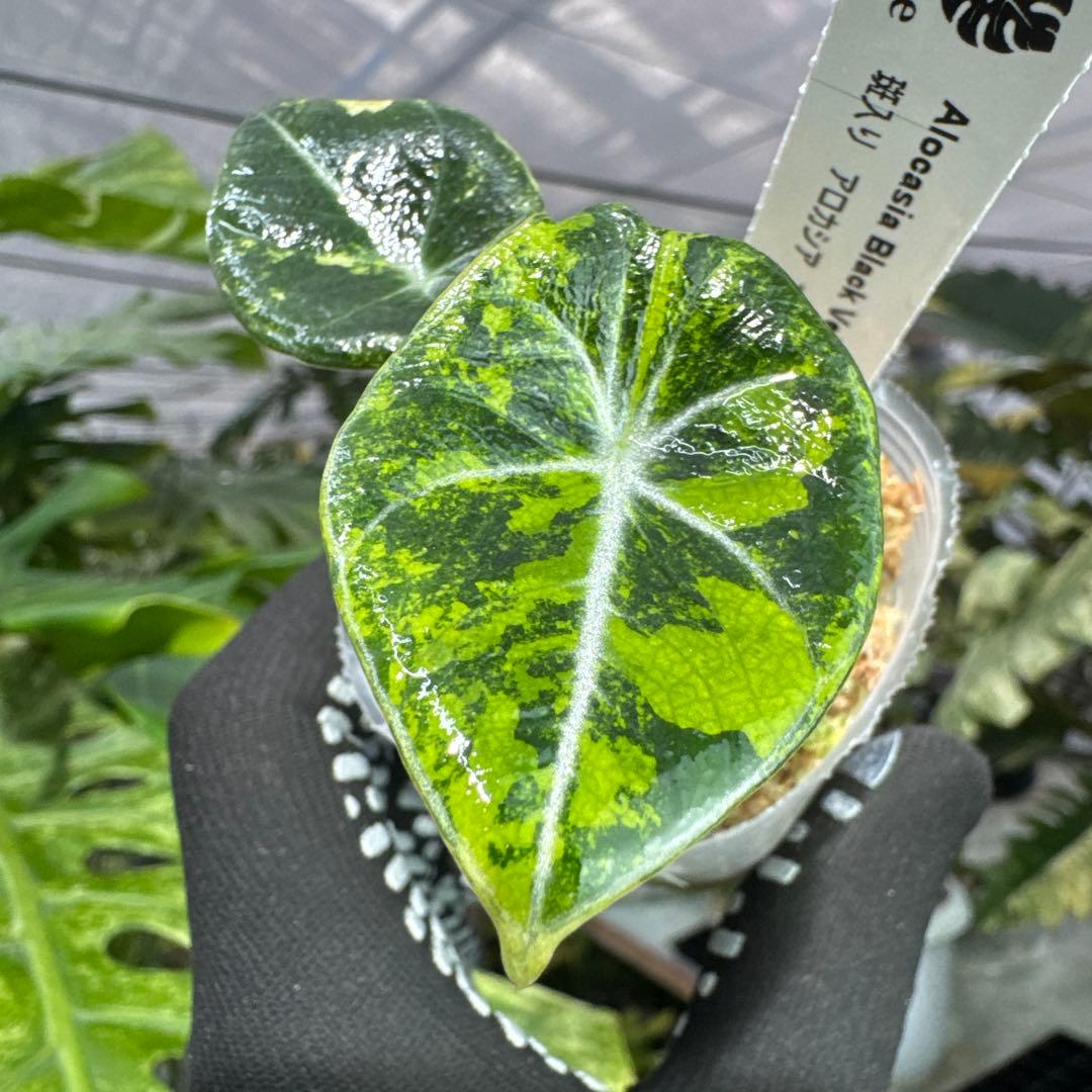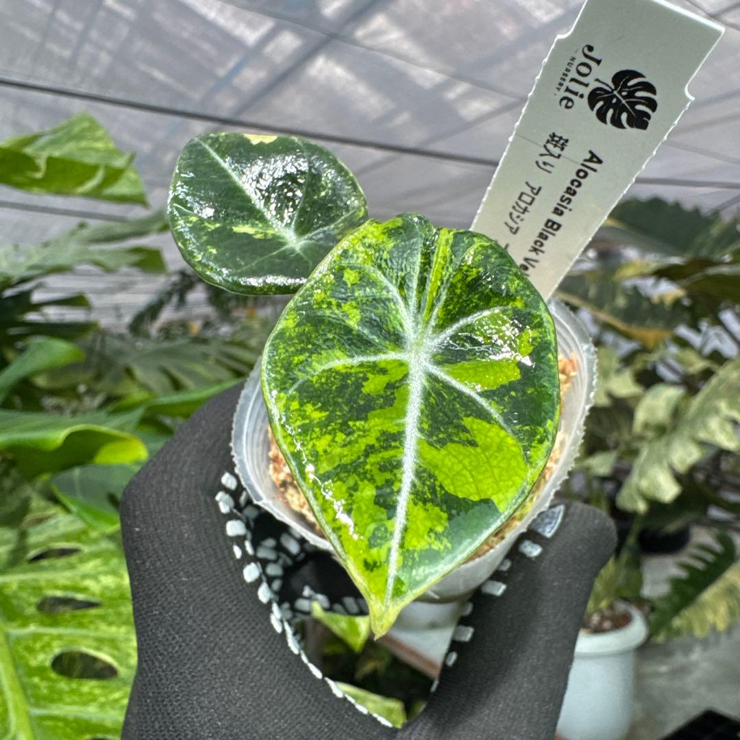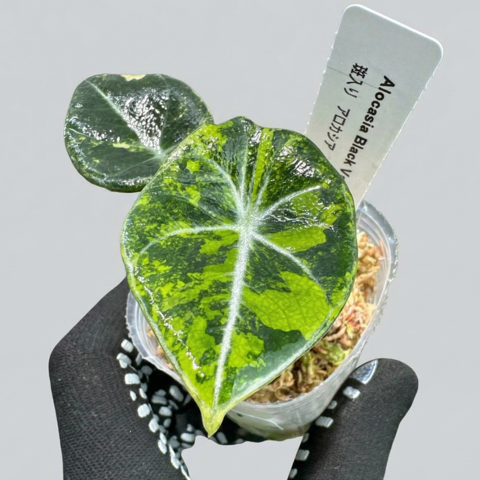 アロカシアの中でも不動の人気を誇るブラックベルベット。その中でも、鮮やかな黄金色の斑が入る極めて希少な「ゴールド(黄斑)」個体がついに登場です。 漆黒に近いダークグリーンのベルベット葉に、突如として現れるイエローの斑は、まさに暗闇に差し込む一筋の光のような美しさを放ちます。