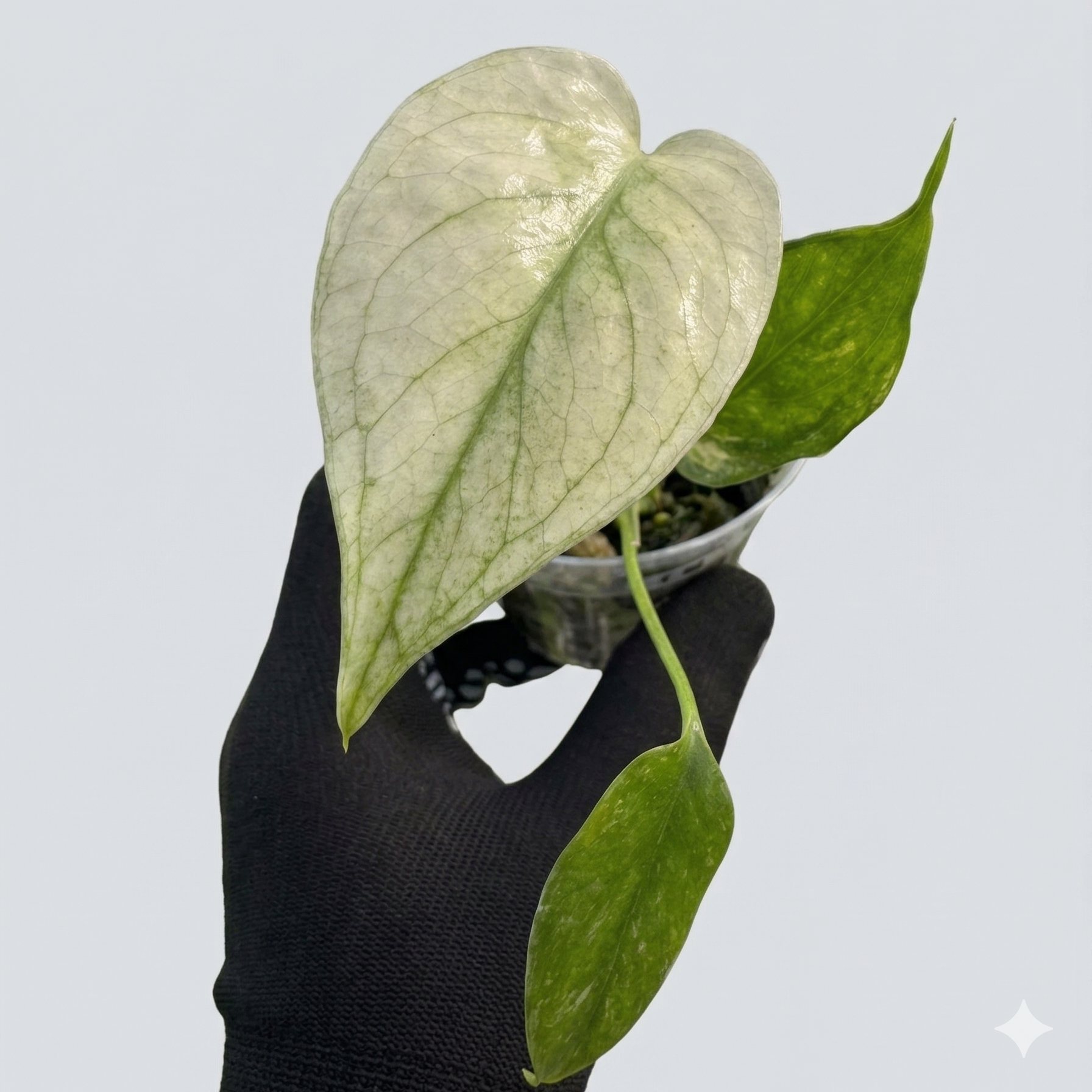 斑入りモンステラの中でも、白斑(アルボ)や黄斑(オーレア)とは一線を画す、幻想的な色彩が魅力の「ミント」。 その名の通り、白と緑が細かく混ざり合い、まるでミントカラーの霧が葉を覆っているような、繊細で奥深い斑の入り方が特徴です。派手すぎず、しかし圧倒的な気品を感じさせるその姿は、まさに植物界の「生きた芸術品」です。